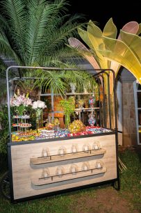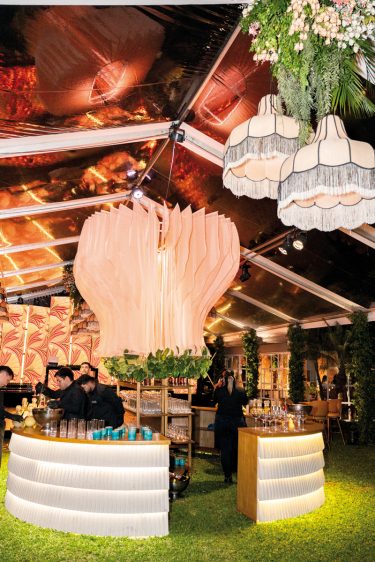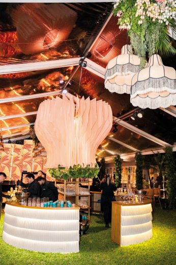 El diseño del evento, a cargo de Óscar Guccione, transformó el escenario con un montaje tropical glam que fusionó a la perfección la naturaleza con la sofisticación. Lámparas vintage con flecos, arcos iluminados y muros verdes crearon un ambiente mágico y teatral. Un bar escenográfico añadió un toque de calidez y distinción, mientras que cada rincón de la Casa Corbellani se aprovechó al máximo: el jardín interno se destinó a los jóvenes y el externo, a los adultos.