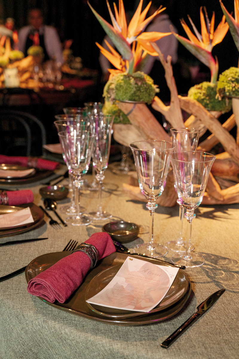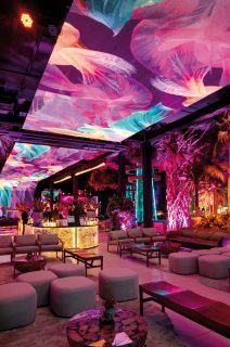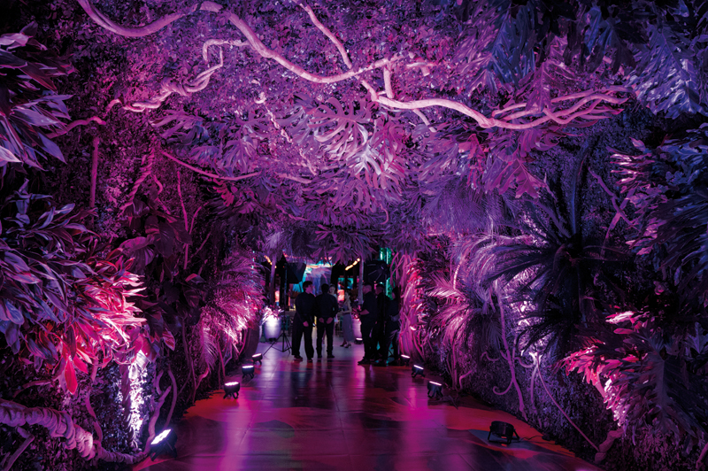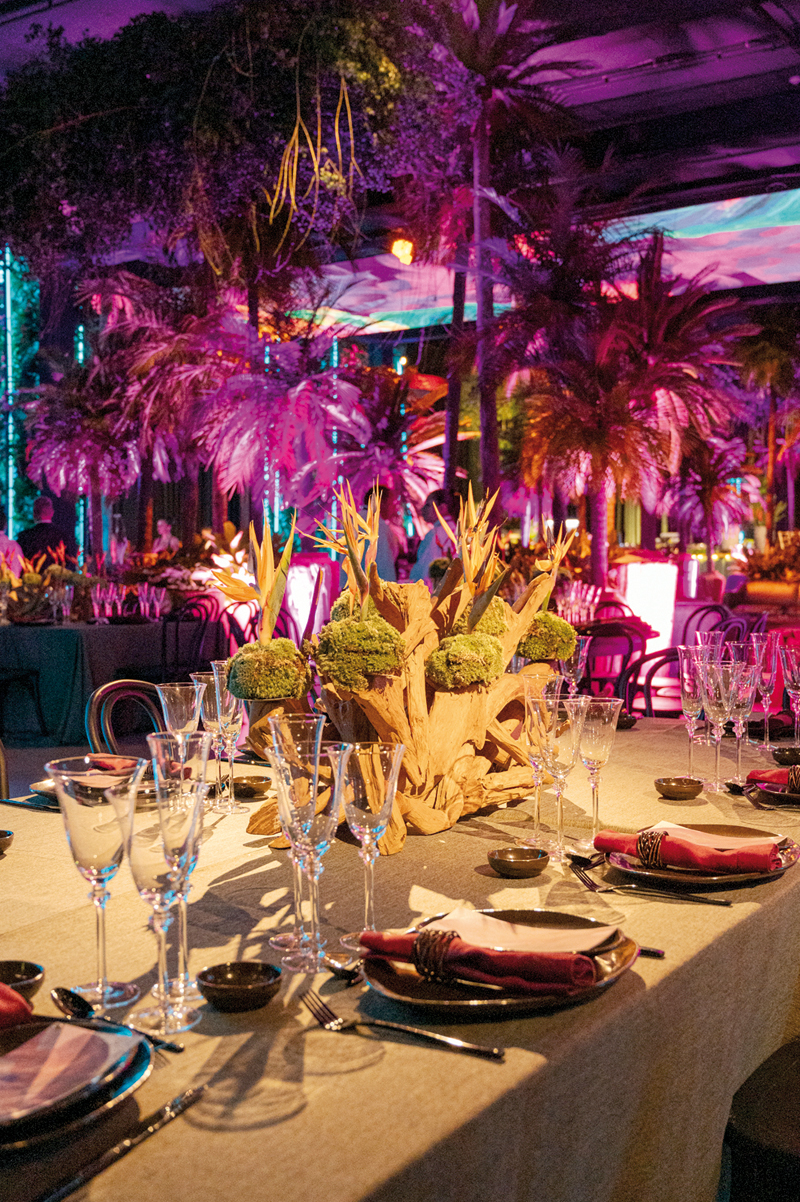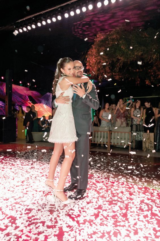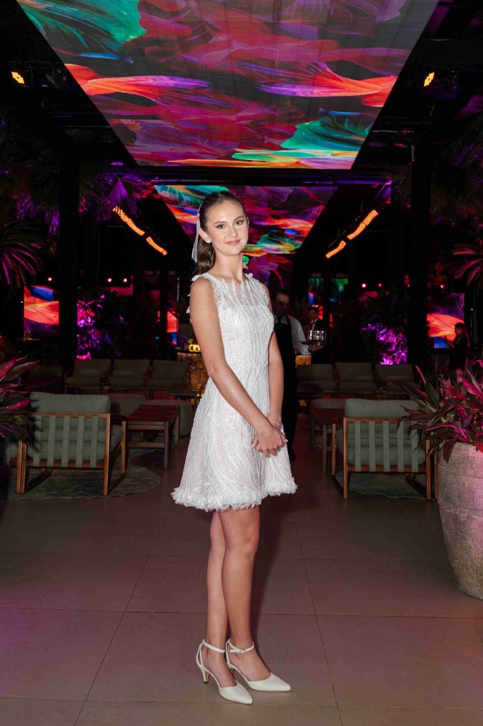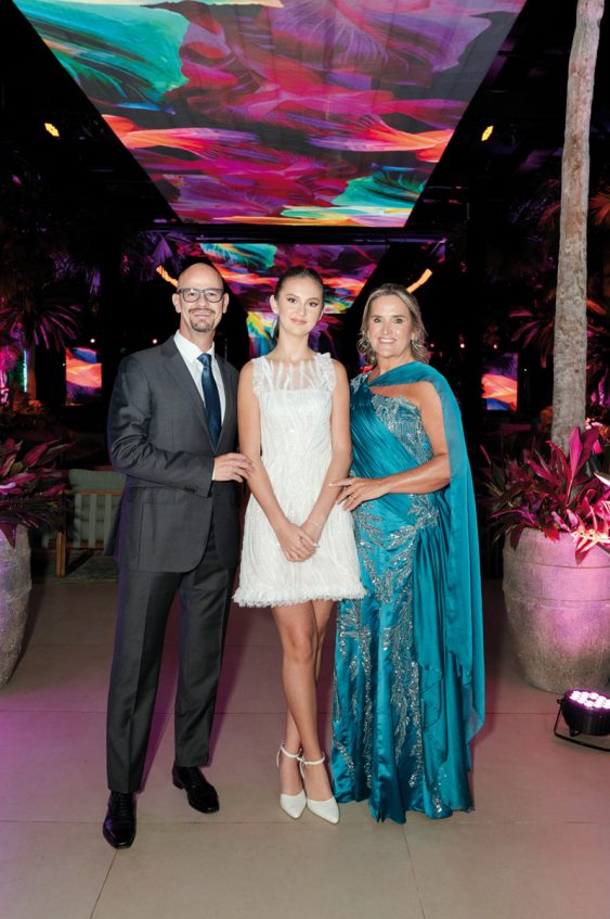 En su gran noche, la quinceañera brilló con luz propia con un delicado diseño de Rebeca Schneiderman hecho exclusivamente para ella. Cada pliegue y cada encaje fueron pensados para contar su historia. Cuando cruzó las puertas del salón, se sorprendió: frente a sus ojos se desplegaba un sueño convertido en realidad. Adrián Aguirre logró con exactitud lo planeado por meses: un paraíso tropical moderno; una jungla de luces, color y frescura donde lo orgánico y lo lumínico se unieron en armonía. Alena sonrió, emocionada; era su mundo, su noche y todo brillaba con ella.