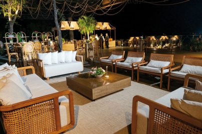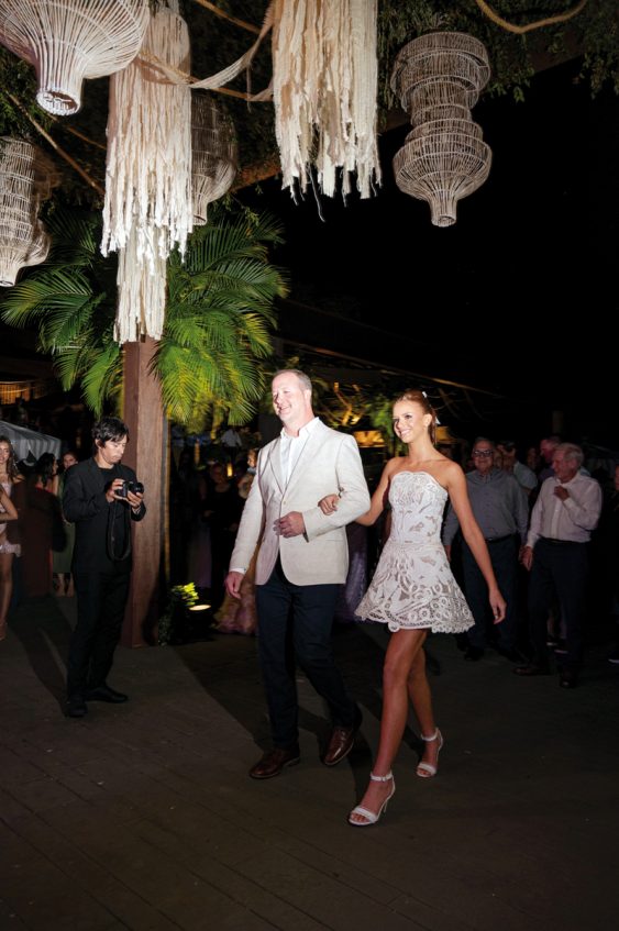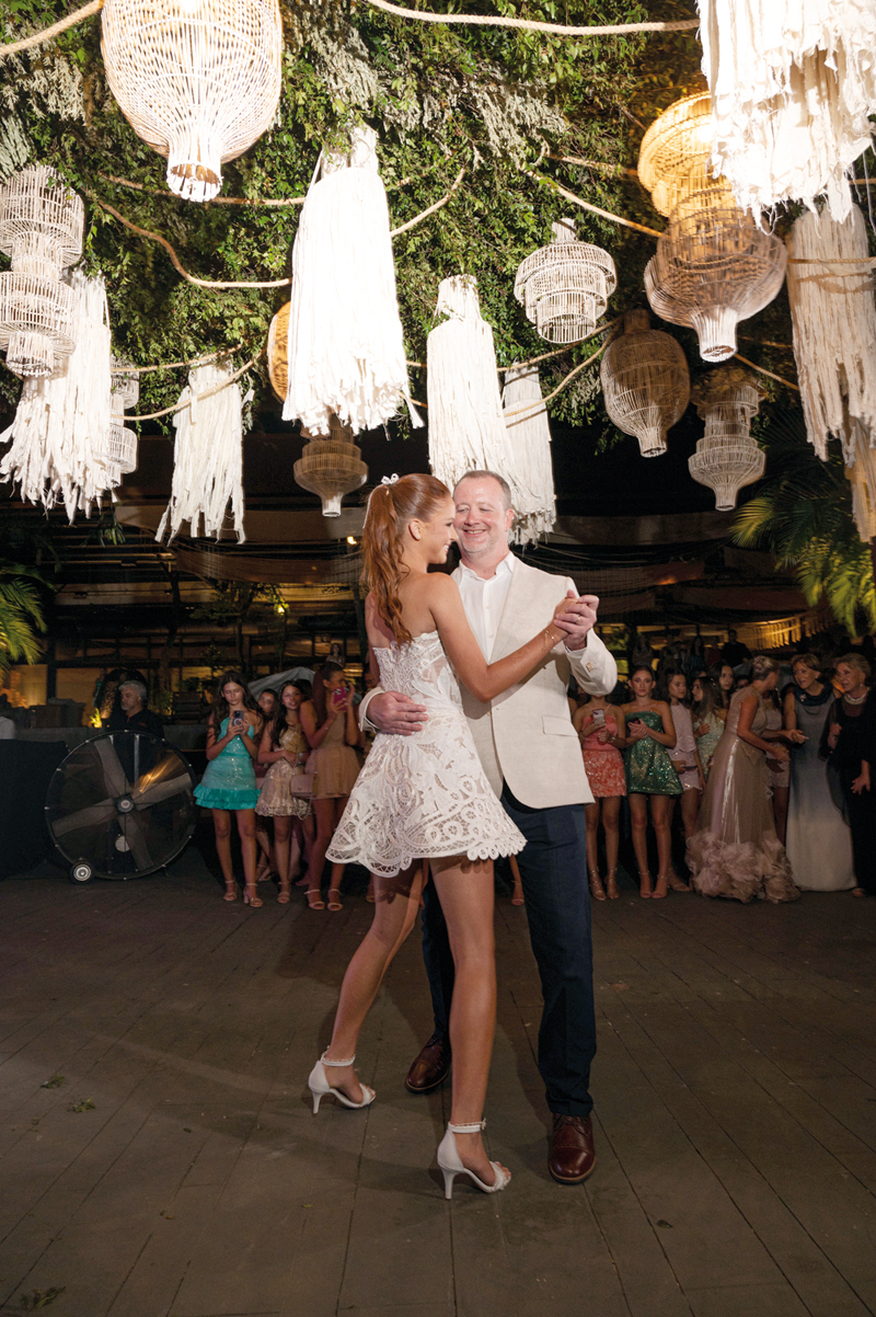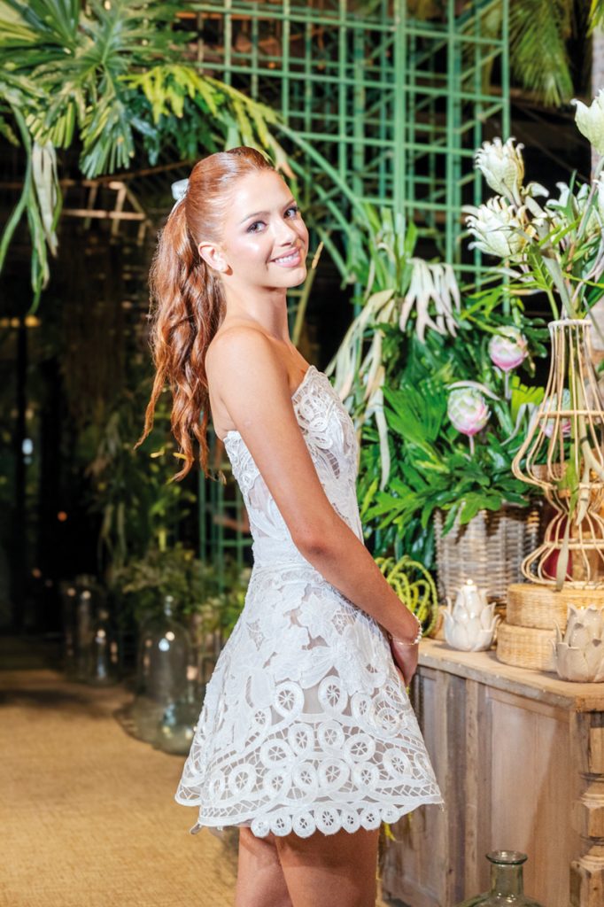 Con una elegancia fresca, luminosa y auténtica, Josefina Guanes Codas Thompson arribó a Es Vedrá para celebrar sus 15 años. Su vestido, strapless de línea A, creación de Stephanie Gosling, fue trabajado artesanalmente con guipur y delicados bordados en hilo y Richelieu.