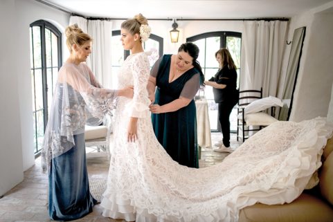 Alegre y emocionada, Luciana pasó la previa a su boda acompañada de su mamá, su prima y sus cuñadas en el hotel Villa María de San Bernardino. De su maquillaje se ocupó Luz Esgaib y del peinado, Éver Martínez, de Bellísima. Una vez lista, se enfundó en el vestido que Romina Ruffinelli le diseñó a medida y portó un ramo de Just Flowers. También cumplió con la tradición al llevar un anillo agua marina que su abuela Carmen Escudero le había regalado a su mamá, Cruz Encina. Para completar su look, lució unos aros de brillantes que su tía Ale Encina le prestó.