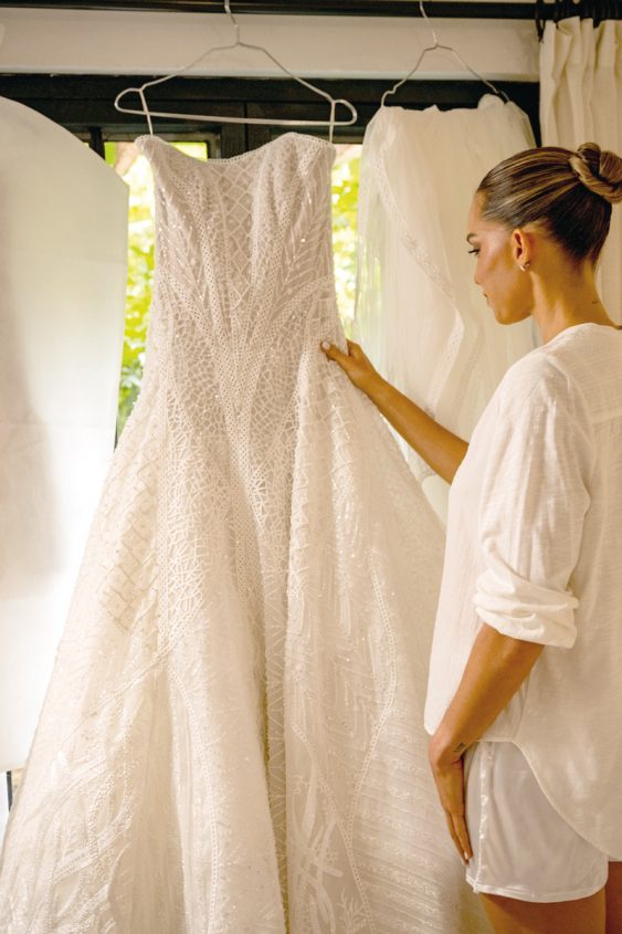 Nicole pasó la noche previa en el Hotel Villa María, en San Bernardino, junto a dos de sus mejores amigas de la infancia. Desayunaron con calma, trotaron un poco para liberar los nervios y luego comenzó la cuenta regresiva. Para el gran día, ella eligió dos creaciones de Florencia Nicora. El primero fue un imponente vestido palabra de honor, casi una escultura hecha a mano. El segundo fue puro espíritu festivo, fiel a su alma aventurera: bordado en plateado, con plumas, acompañado de unos calzados deportivos, también bordados por Florencia. Un look pensado para bailar y disfrutar.