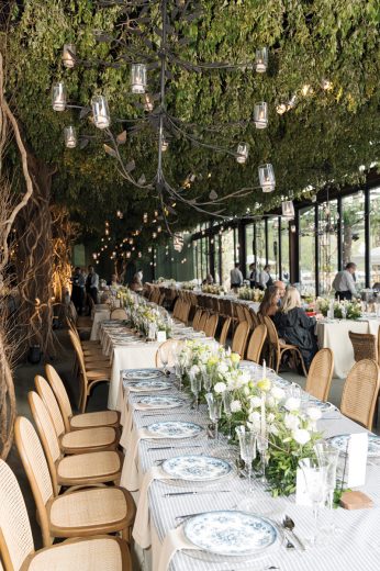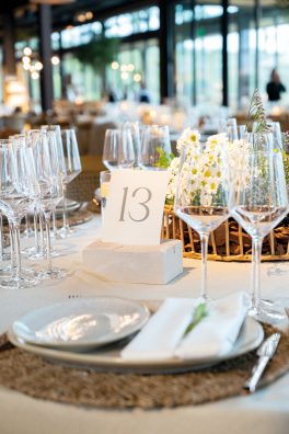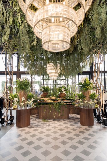 A las 16.20, uno de los momentos más esperados del día tuvo lugar: la llegada de la novia, que deslumbró con un vestido de alta costura creado por Tamara Maluff, de La Paix, un diseño único que fusionó encaje chantillí con tul bordado en cristales. Su silueta entallada, escote en V profundo y hombreras de cristal resaltaron una elegancia atemporal, mientras que la falda completamente desmontable permitía transformar el atuendo en un vestido mini, perfecto para la fiesta. Un velo majestuoso y un ramo de calas —con tres de ellas de cristal, de la firma Coolook— completaron su impecable look nupcial.