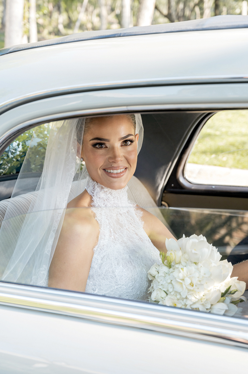 La mañana de su boda, Giuli se despertó con una mezcla de nervios y emoción. Se preparó en Villa María, en una previa llena de risas y complicidad, rodeada de sus amigas y su familia. El momento más esperado fue cuando se puso su vestido, una creación de Tamara Maluff de La Paix, el diseño de sus sueños: de estilo romántico y clásico con cuello halter, adornado con encajes. Cada prueba de vestuario fue un paso más hacia ese día, un proceso creativo que culminó en la pieza perfecta.