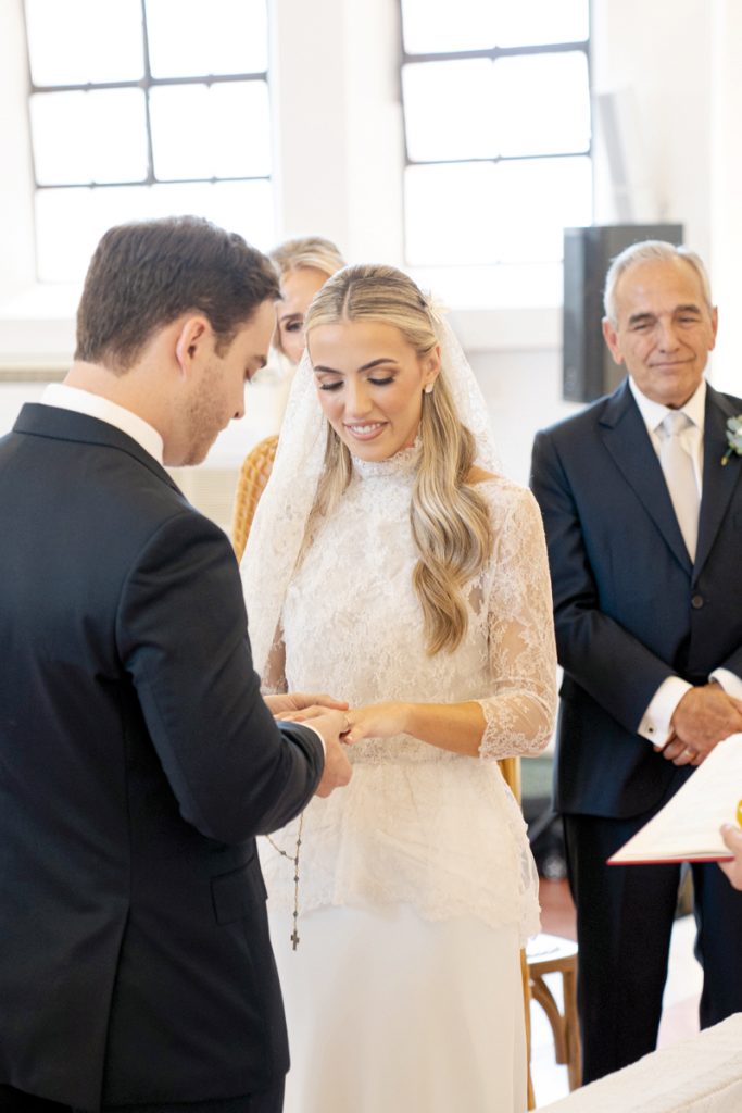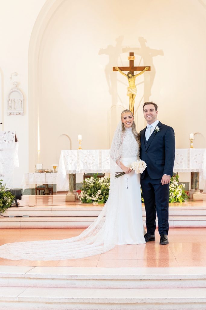 Para la novia, el vestido fue una de las partes más memorables del proceso. Creado por Florencia Soerensen, cada prueba representó un momento colmado de ilusión. “Fue de lo que más me ocupé y la parte que más disfruté”, confiesa Inés. El diseño, sobrio y elegante, presentaba un cuello halter y una falda de crepé con drapeado suave. Sin embargo, el detalle más conmovedor fue la blusa que usó durante la ceremonia religiosa: la misma que llevó su madre en su propia boda hace 32 años, un gesto cargado de significado que tejió pasado y presente con delicadeza. Su ramo fue una creación de Laefe. Alexis González la peinó y Ámbar Mascareño la maquilló.