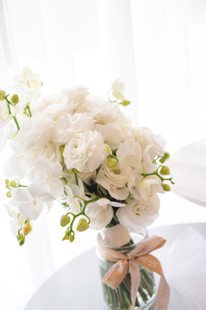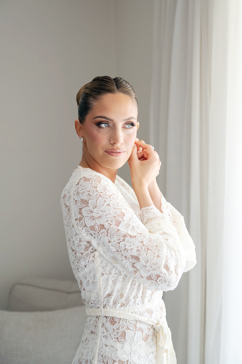 En su gran día, Stephie se preparó en la casa de su hermana Nicole, el hogar donde creció, donde cada pared guarda un recuerdo. Vestirse ahí, rodeada de esa intimidad familiar y la compañía de sus mejores amigas, fue casi una ceremonia en sí misma. Y luego llegó el momento de la verdad: se puso su vestido, una creación de Florencia Sorensen delicada y etérea, que parecía haber sacado de los sueños de la novia, y lo complementó con un tocado elaborado por Jota.a en conjunto con Eternity. En sus manos portó un ramo de Vita Rosa y en sus pies, una creación a medida de Josefina Alcázar.