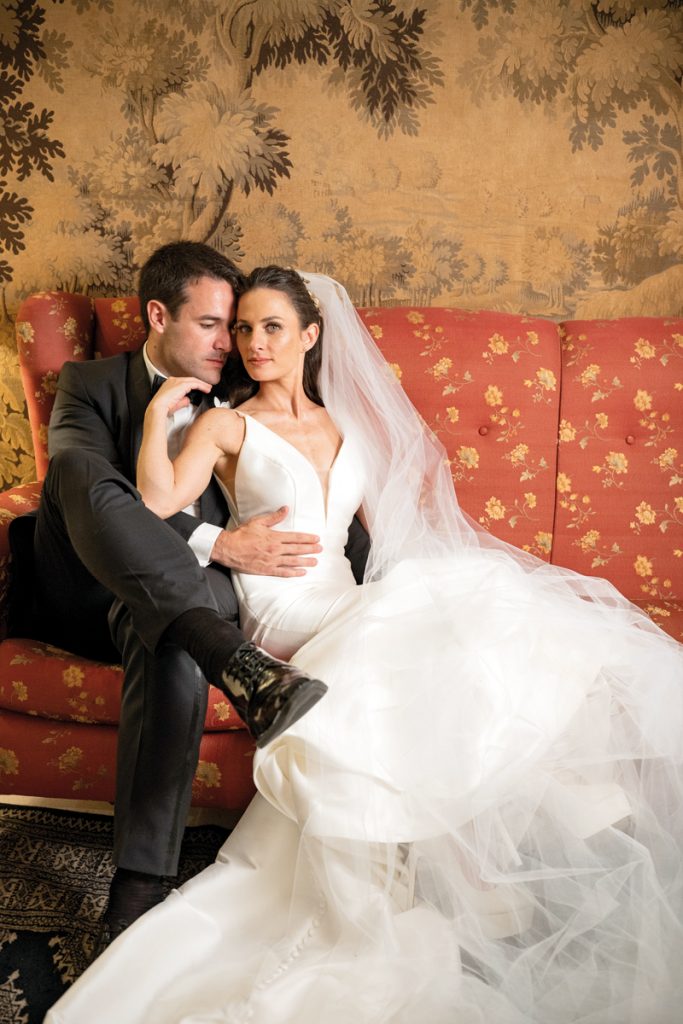 Agus se preparó en el Hotel Nino, rodeada de sus amigas y familiares. En su gran día optó por un vestido de Rosa Clará de mikado elástico, elegido especialmente en compañía y asesoría de su hermana Myriam Raphael. “Yo quería que sea una novia disruptiva y Agus me escuchó, estaba perfecta”, relata Myriam. Para la fiesta, confió en el talento de Beverly Kuhl y Martina, con su segundo look tan soñado como el primero. Llevó un tocado delicado de Jota A, un ramo diseñado por Laefe y Algo Más que Flores, un medallón de nácar y platino con brillantes, y la imagen de la Virgen de la Dolorosa, perteneciente a su bisabuela. Fue la cuarta generación en llevar la efigie al altar. La tradición, la fe y el amor, todos caminando con ella.