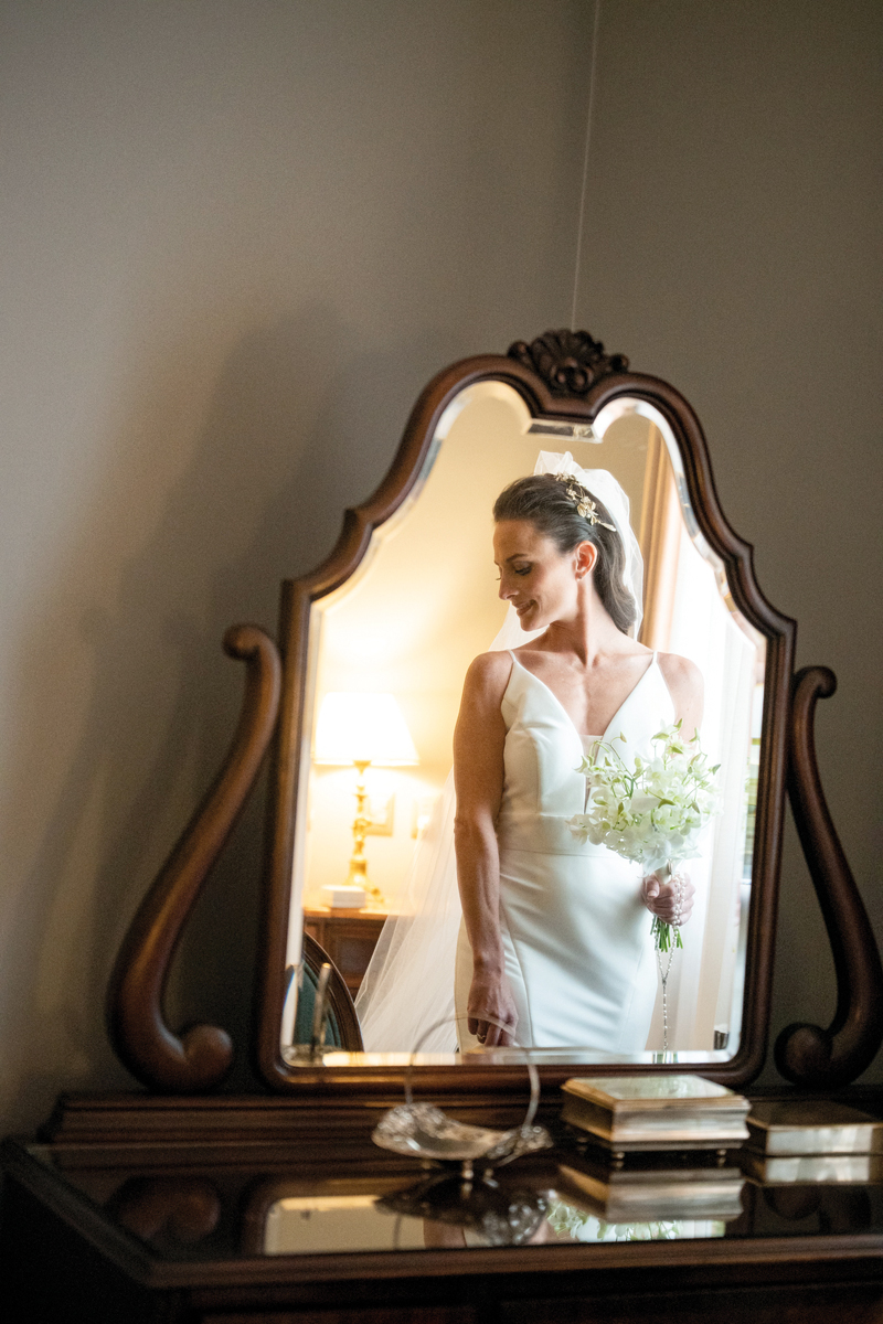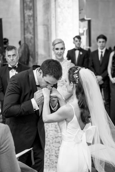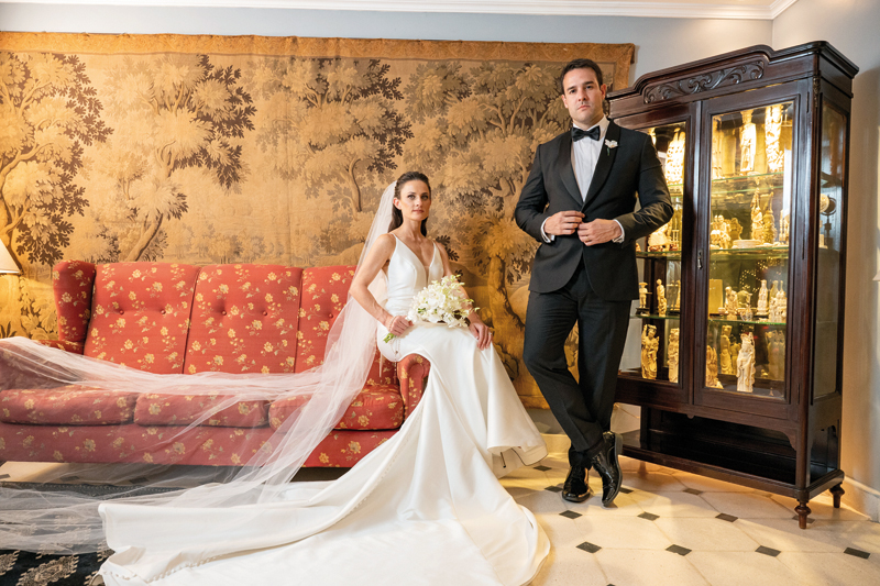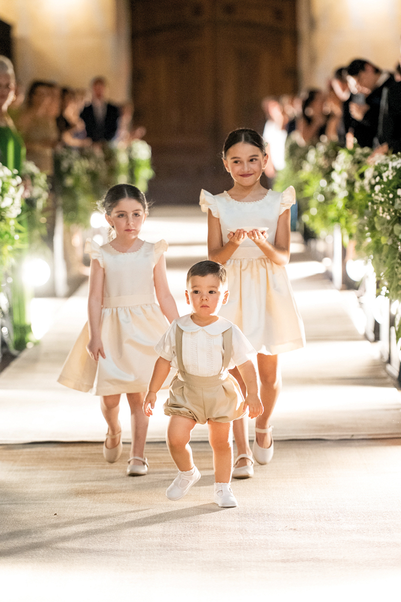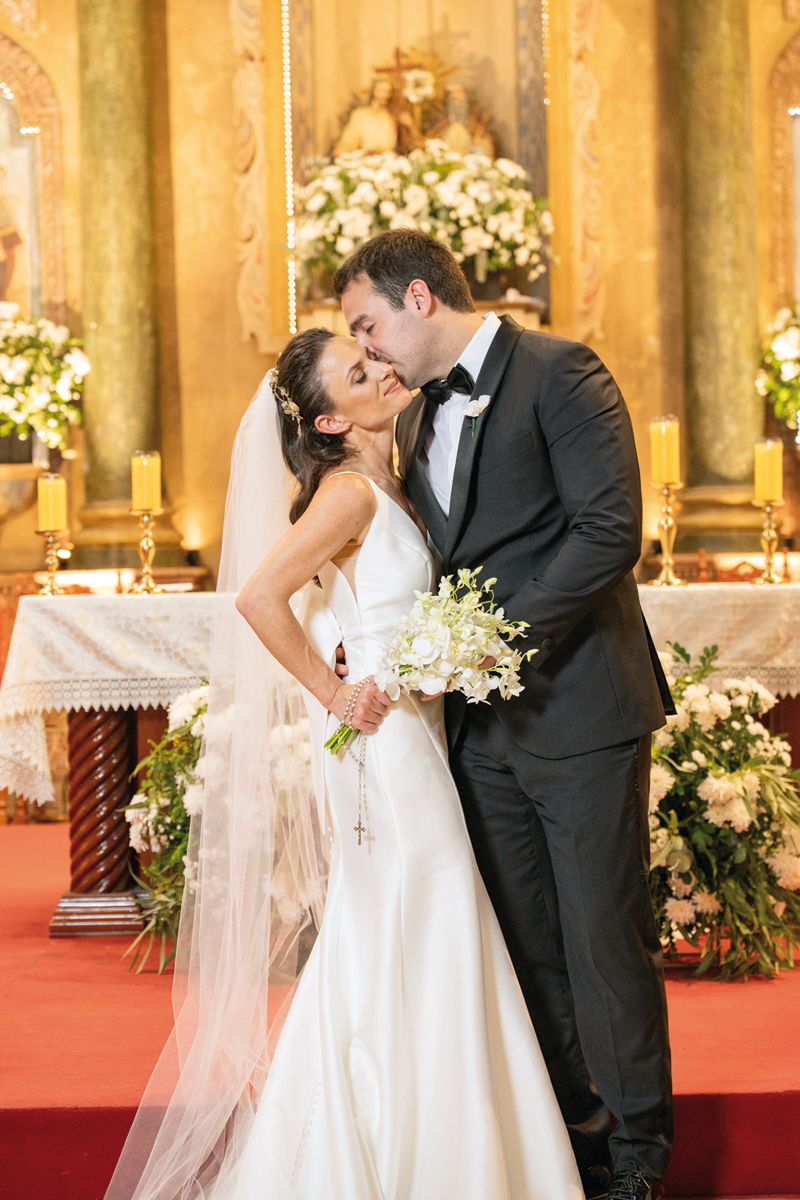 Agus se preparó en el Hotel Nino, rodeada de sus amigas y familiares. En su gran día optó por un vestido de Rosa Clará de mikado elástico, elegido especialmente en compañía y asesoría de su hermana Myriam Raphael. “Yo quería que sea una novia disruptiva y Agus me escuchó, estaba perfecta”, relata Myriam. Para la fiesta, confió en el talento de Beverly Kuhl y Martina, con su segundo look tan soñado como el primero. Llevó un tocado delicado de Jota A, un ramo diseñado por Laefe y Algo Más que Flores, un medallón de nácar y platino con brillantes, y la imagen de la Virgen de la Dolorosa, perteneciente a su bisabuela. Fue la cuarta generación en llevar la efigie al altar. La tradición, la fe y el amor, todos caminando con ella.