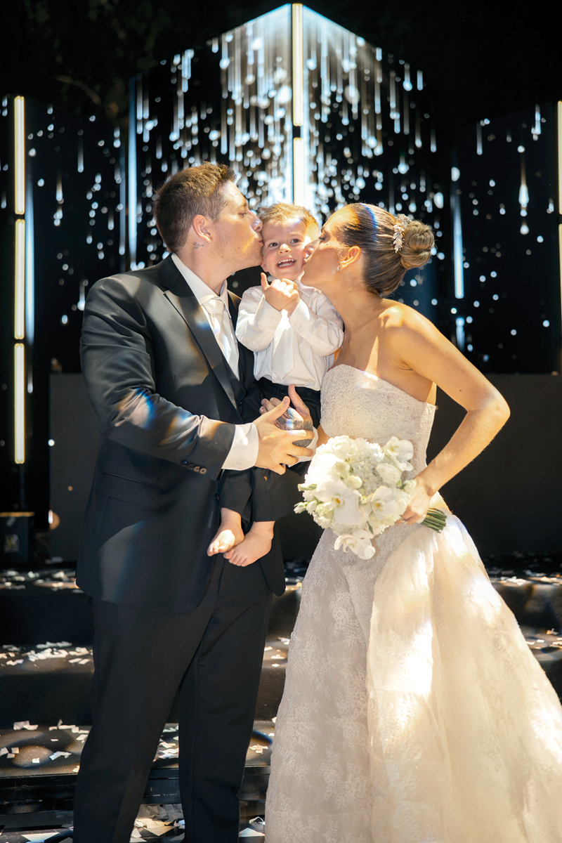 Con el deseo de tomarse de las manos para siempre, la cita fue en la capilla Virgen de Fátima. A la hora pactada, el novio y los invitados aguardaban ansiosos la llegada de Pauli. El instante más sublime ocurrió cuando las puertas de la iglesia se abrieron: la emoción desbordó el corazón de la novia al cruzar el umbral y encontrar, al final del pasillo, la mirada de Dominik con su hijo Benicio en el altar. Fue un encuentro de tres, un lazo familiar inquebrantable que convirtió ese momento en el más especial.
