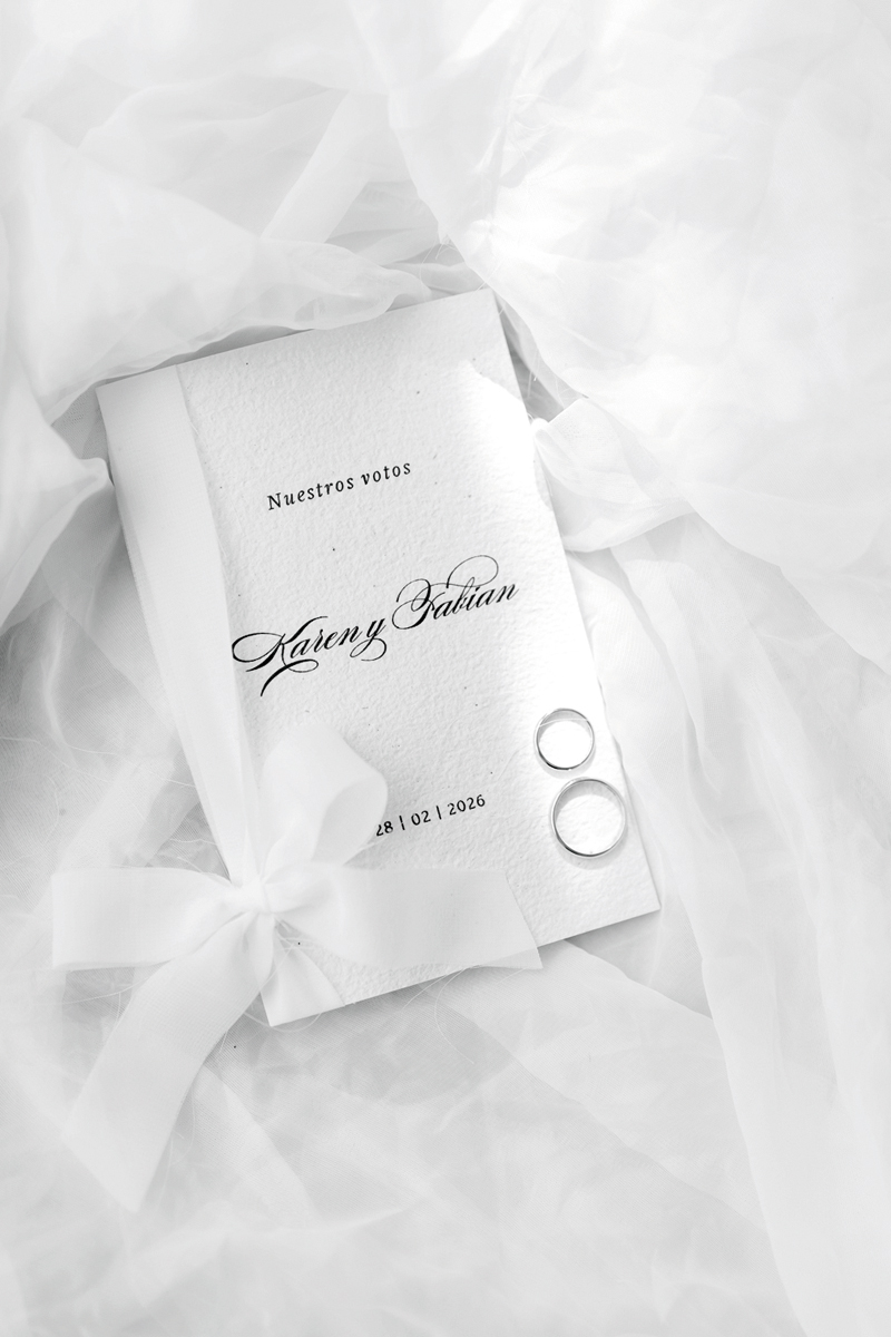 Karen es decoradora y diseñadora. A lo largo de su carrera fue testigo de muchas bodas y momentos especiales, pero el vestido más emotivo que le tocó hacer fue el suyo. El traje nupcial lo ideó ella misma y lo confeccionó la señora Elena Canepa. Quería una pieza estilo europeo, lisa, clásica, elegantemente atemporal, que no respondiera a una moda sino a una historia. Complementó su look con un tocado de Jadiyi Yaluff. Fue maquillada por Óscar Rojas y peinada por Manu Roa, de La Pelu Hair. Cada elección, cada gesto, fue de una novia que soñó con tanto cariño su gran día.