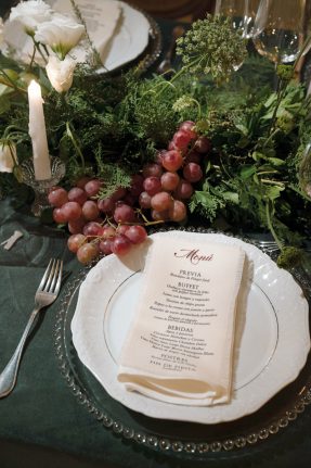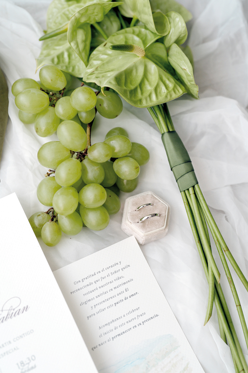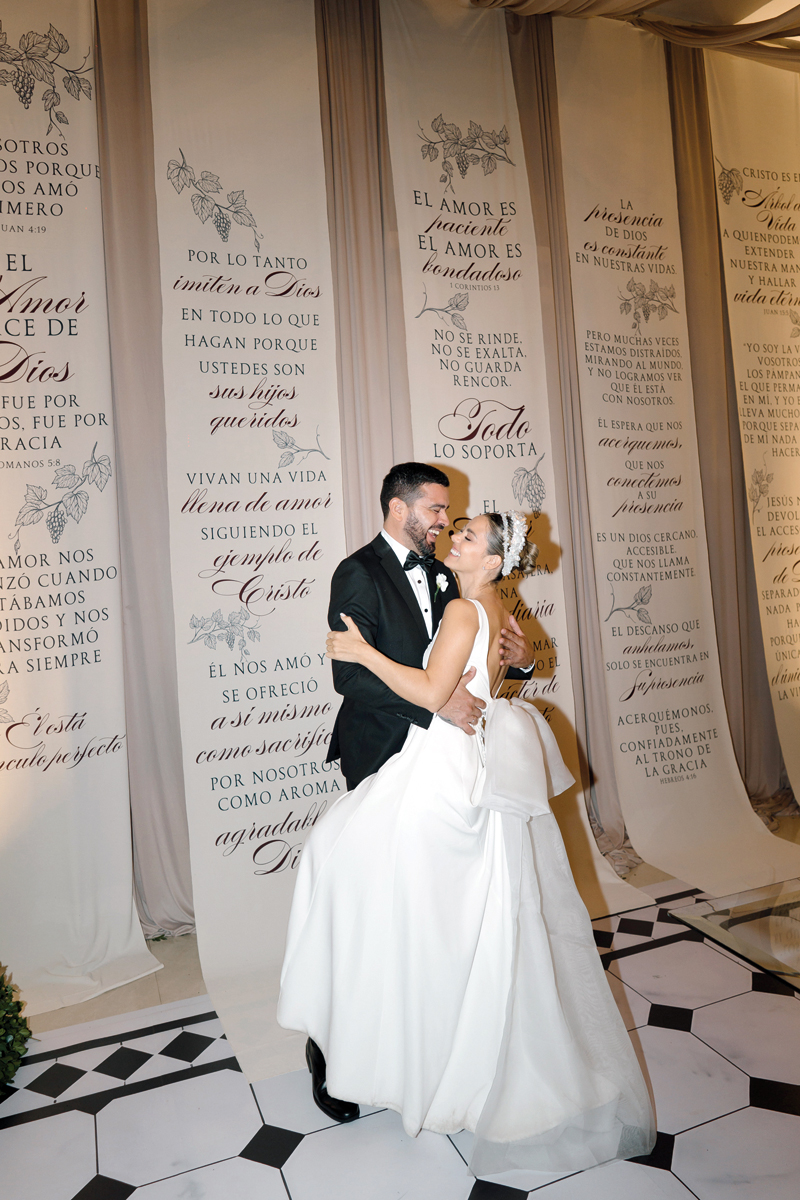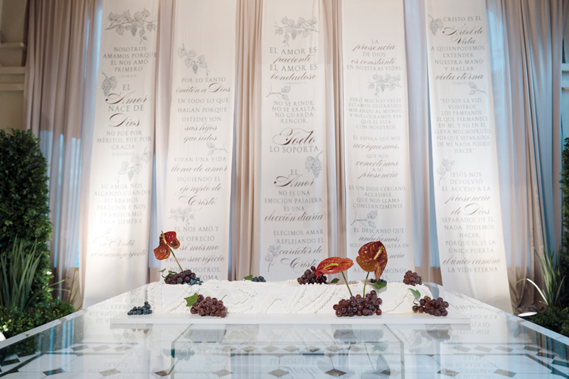 El 28 de febrero de 2026, en el salón La Riviere, esa promesa se materializó. La noche se desplegó con un aire sereno y colmado de alegría. La decoración, inspirada en el versículo bíblico Juan 15:5, sobre la vid verdadera, envolvió el ambiente con racimos de uvas verdes y bordó. Cada detalle hablaba de raíces, crecimiento y amor sostenido en el tiempo.