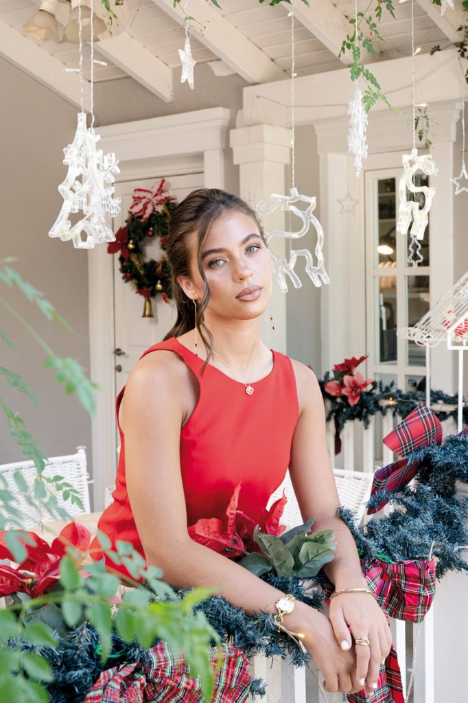 J: – Para las fechas festivas me encanta armar un look pen – sado: prendas distintas, texturas y accesorios que destaquen. Es mi excusa para jugar con la moda y darle mi estilo elegante. Mis esenciales son las faldas estilizadas, los vestidos fluidos o un buen top combinado con un conjunto que tenga movimiento y personalidad.